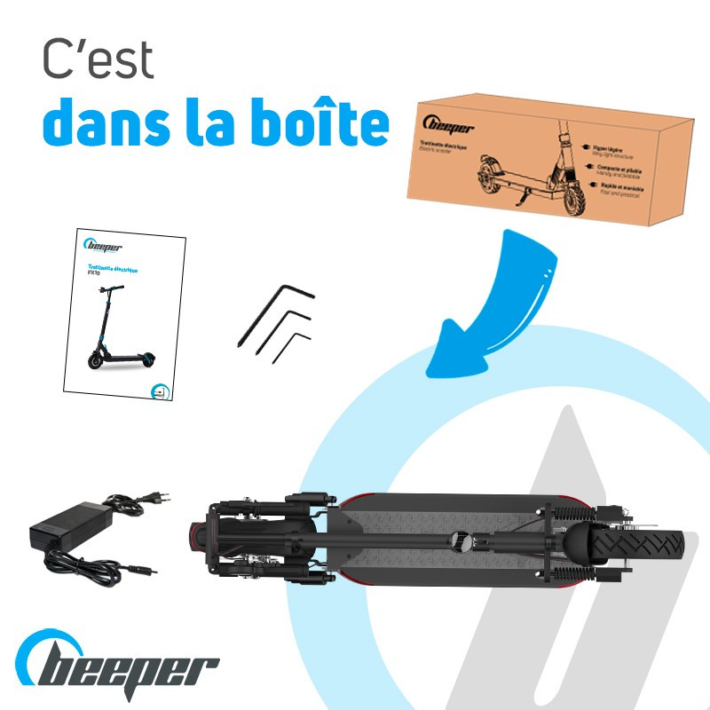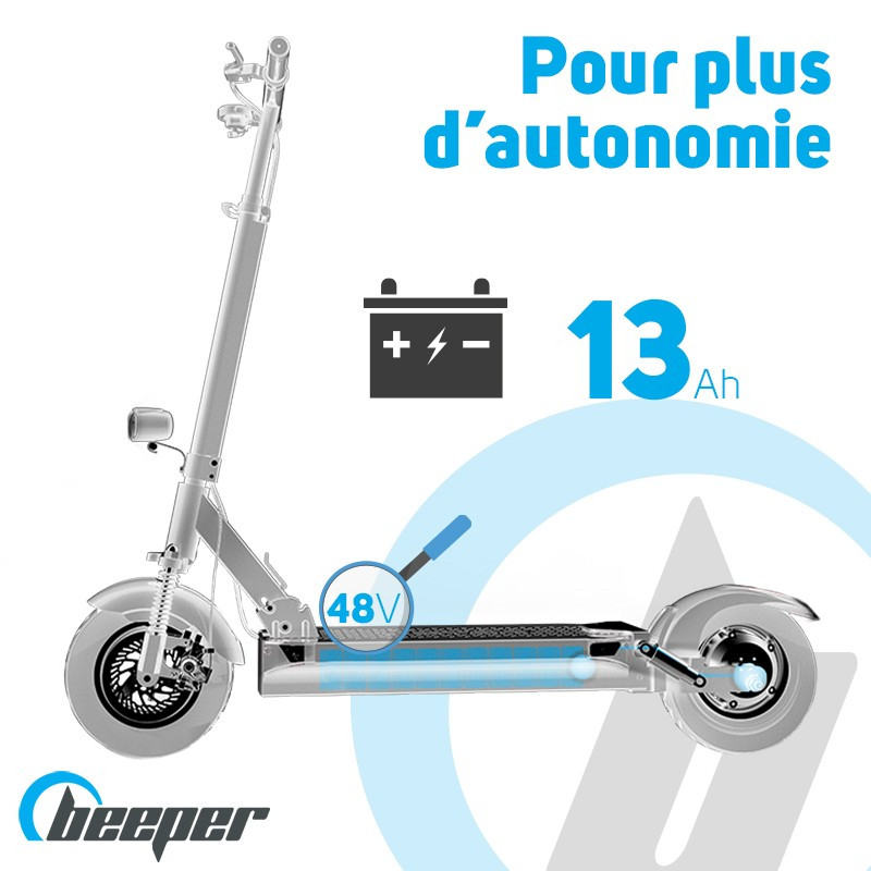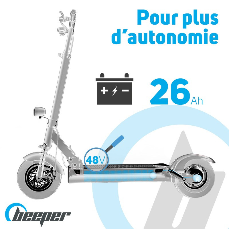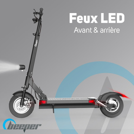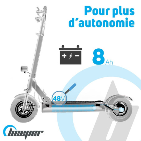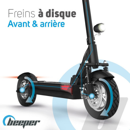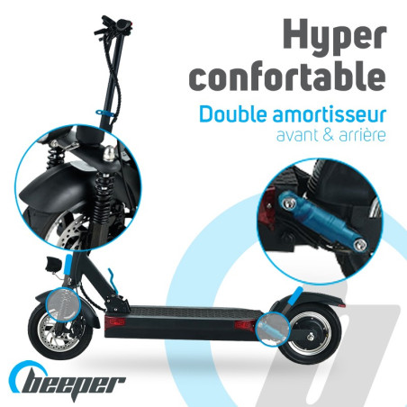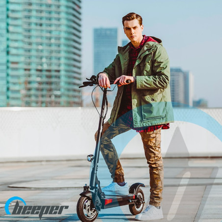 The Beeper MAX electric scooter is the ideal scooter for your trips, whether short or long: with its comfort thanks to its double front suspensions, its 10'' inflated wheels, its average range of 35 km to 90 km (depending on the chosen version) and its 500W motor it will take you everywhere with its power and comfort.