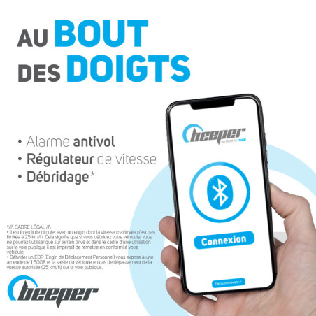 */!\ LEGAL FRAMEWORK /!\ - It is forbidden to operate a vehicle with a maximum speed not limited to 25 km/h. This means that if you dismantle your vehicle, you can only use it on private land, and if you want to use it on public roads, you must bring your vehicle into compliance. - If you dismantle an EDP (Engin de Déplacement Personnel), you could be fined €1,500 and have your vehicle seized if you exceed the authorized speed limit (25 km/h) on public roads. - We remind you that your vehicle must be insured (minimum civil liability declaration), and we advise you to wear a helmet and protective equipment.