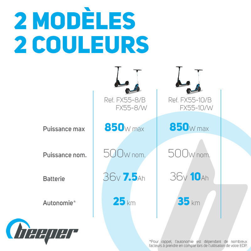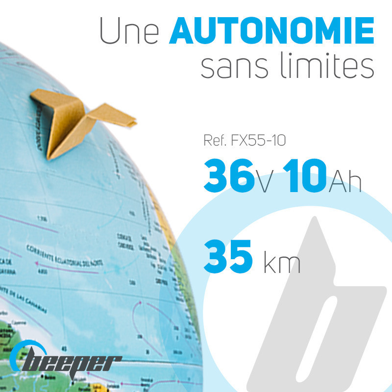 - A battery36V 10AhFor aautonomy from 35 km (Ref. FX55-10/B, FX55-10/W)