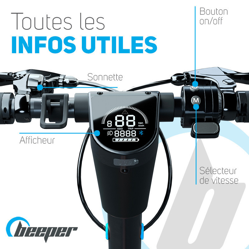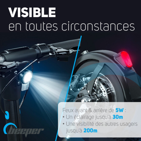 The scooterBeeper PRIME features front and rear LED lights ultra-powerful from 5W for visibility up to 30m.