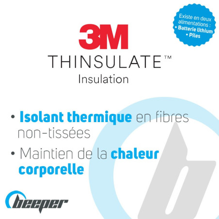 Los guantes calefactables Beeper incorporan un aislamiento térmico 3M creado y desarrollado en exclusiva por 3M THINSULATE Insulation. Creado a partir de fibras no tejidas, el aislamiento 3M THINSULATE es el mejor material para mantener el cuerpo caliente.