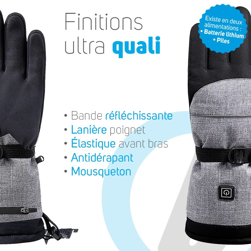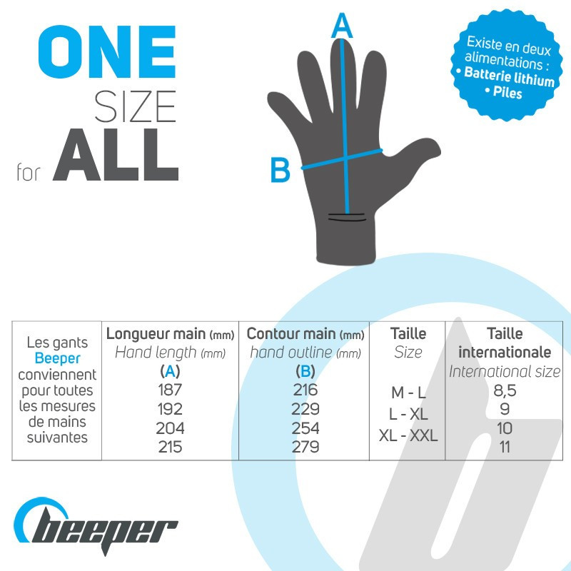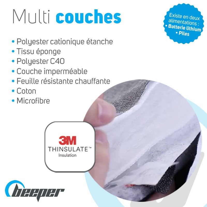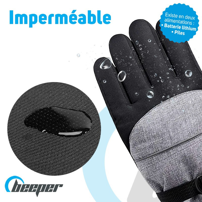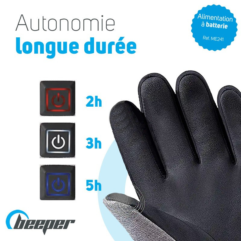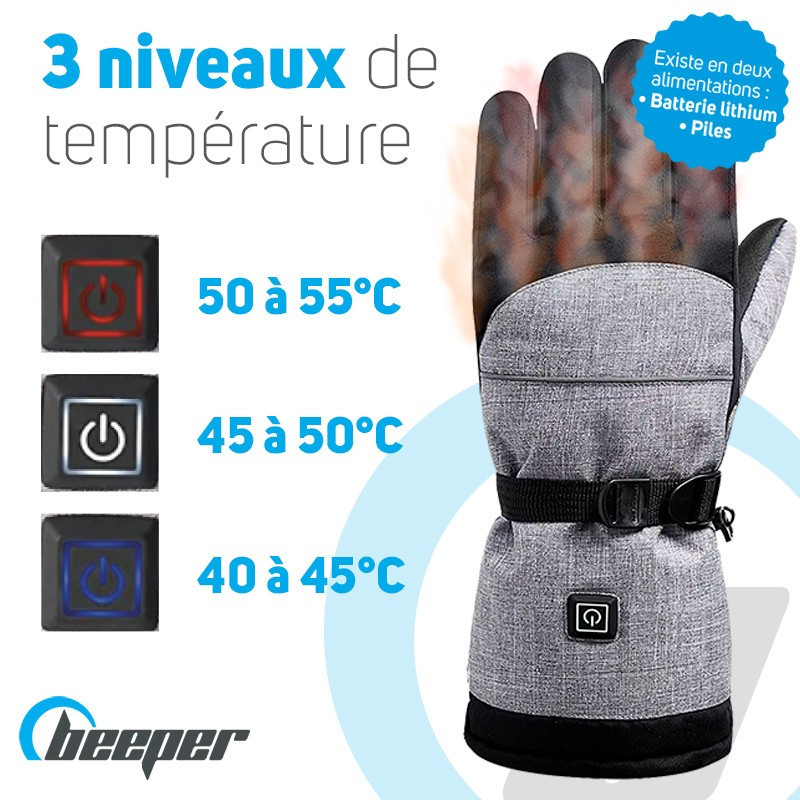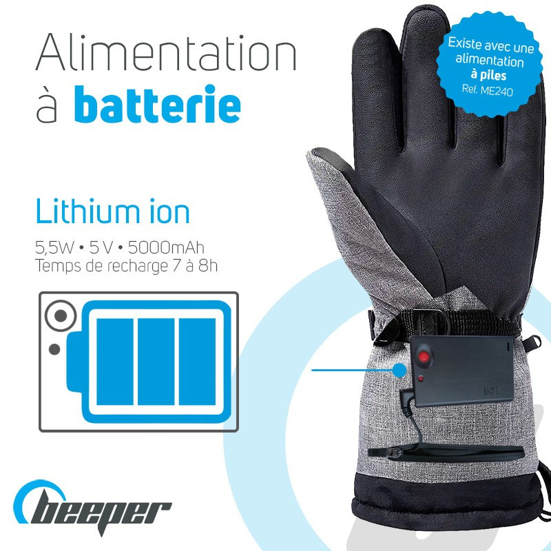 Descubra los guantes térmicosBeeper disponibles en dos versiones: a pilas (AAA LR6 no incluidas) o a batería (Li-ion), Con su aislamiento térmico 3M y su resistencia a la calefacción, le permiten mantener el calor corporal y calentar las manos hasta 55°C.