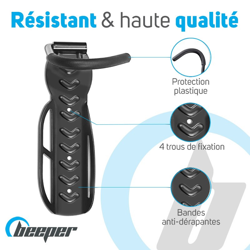 Este soporte de alta resistencia está diseñado para soportar un peso importante pero también para no dañar su medio de transporte; con su gancho antideslizante, no rayará su vehículo de dos ruedas, podrá guardarlo sin temor a dañarlo.