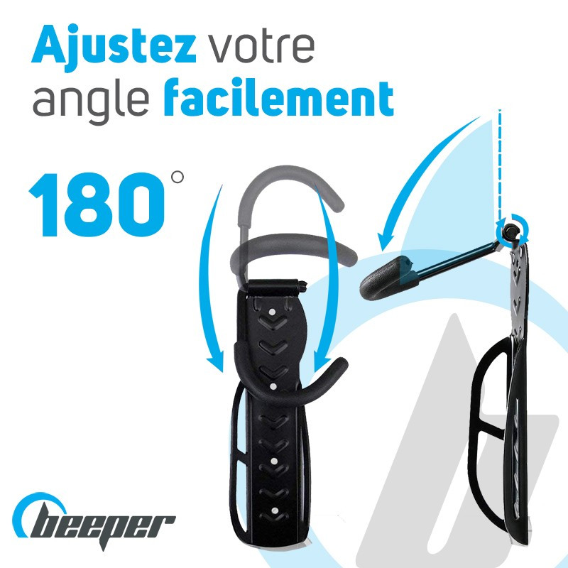 Su gancho gira 270° (180° cuando está fijado a la pared) y le permite introducir fácilmente la rueda delantera o trasera de su vehículo de dos ruedas.