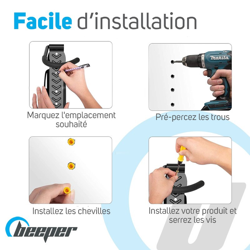 De pequeño tamaño pero muy resistente, este soporte tubular de pared para dos ruedas es muy fácil de instalar gracias a sus orificios preperforados.