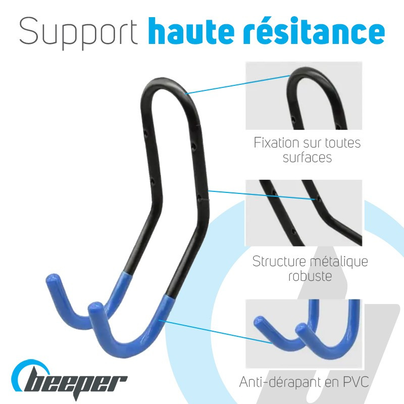 Este soporte de alta resistencia está diseñado para soportar un peso importante pero también para no dañar su medio de transporte; con sus soportes antideslizantes, no rayará su vehículo de dos ruedas, podrá guardarlo sin temor a dañarlo.
