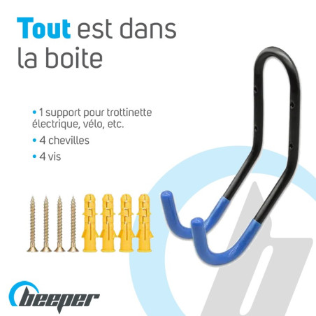 Para guardar su producto, debe fijar el manillar de su vehículo de dos ruedas al soporte de pared. Práctico y rápido, podrá enganchar y desenganchar su vehículo de dos ruedas en un abrir y cerrar de ojos.