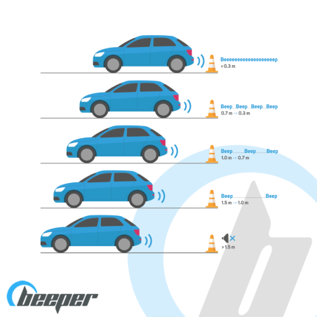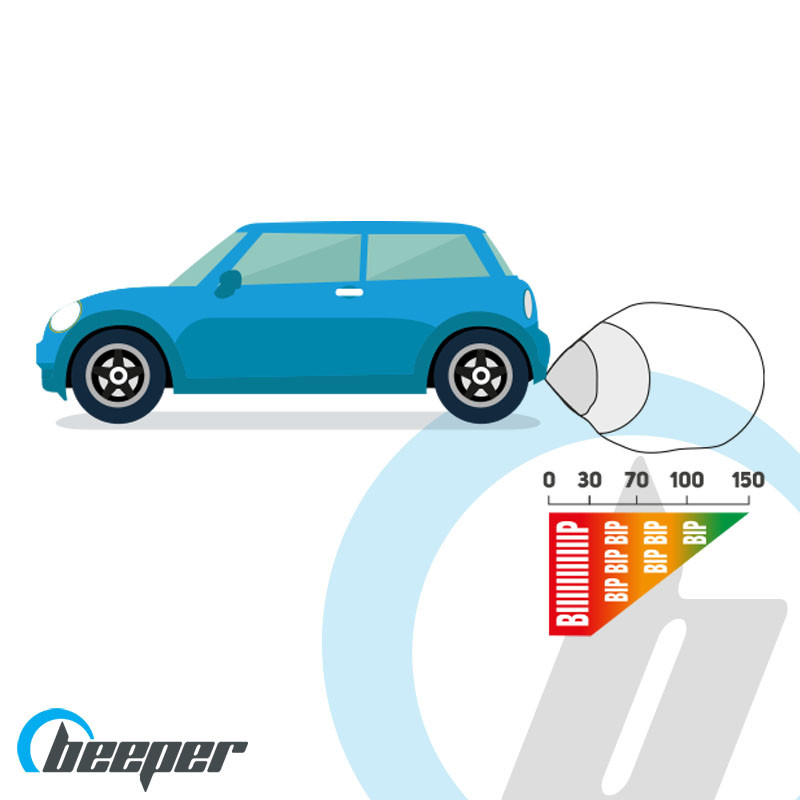 En cuanto pone el coche en marcha atrás, los 4 sensores detectan la presencia de posibles obstáculos detrás del vehículo. A medida que se acerca a un obstáculo, los pitidos se acercan cada vez más. Cuando la señal se vuelve continua, su parachoques está a menos de 30 cm del obstáculo.