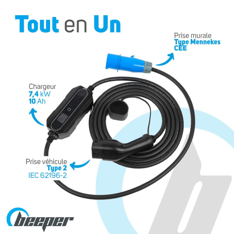 Equipado con un enchufe de tipo 2 para vehículos y una toma de corriente de pared tipo CEE de Mennekes, el cable Beeper e-charge PLUS es, por tanto, compatible con todos los vehículos del mercado equipados con una toma de corriente de tipo 2.