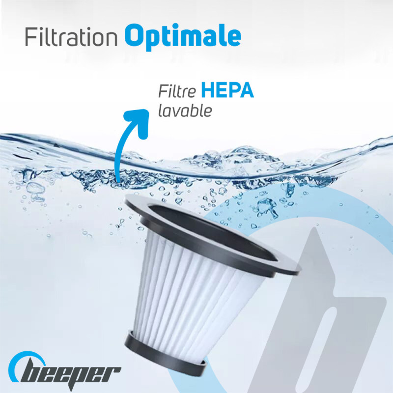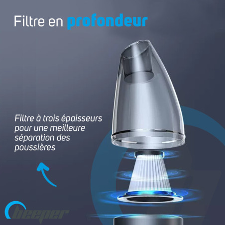 Equipado con un filtro HEPA de 3 capas, nuestro mini vacío sin cable tiene un alto poder de filtrado para capturar el polvo en profundidad.
