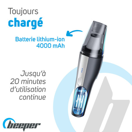 Nuestra mini vacío sin cable cuenta con una batería de iones de litio de 4000 mAh para ofrecerte un uso continuo de hasta 20 minutos.