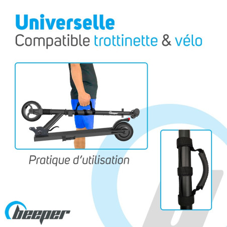 Este asa de transporte universal es ideal para los propietarios de scooters eléctricos o de bicicletas plegablesque buscan una forma eficaz de transportar su máquina durante un viaje (metro, autobús, etc.).