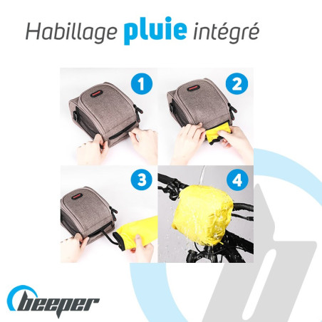 Pour une utilisation optimale, quel que soit le temps, notre sacoche universelle possède un habillage pluie intégré et dissimulé dans une poche.