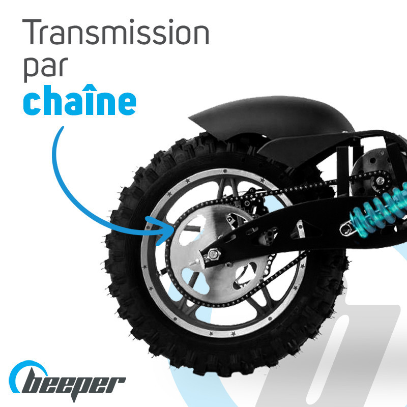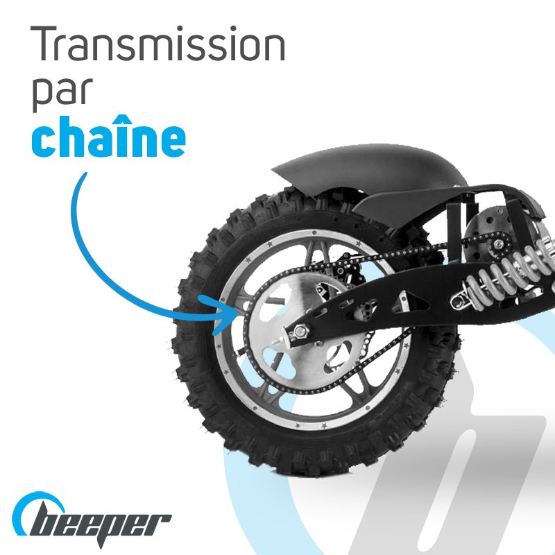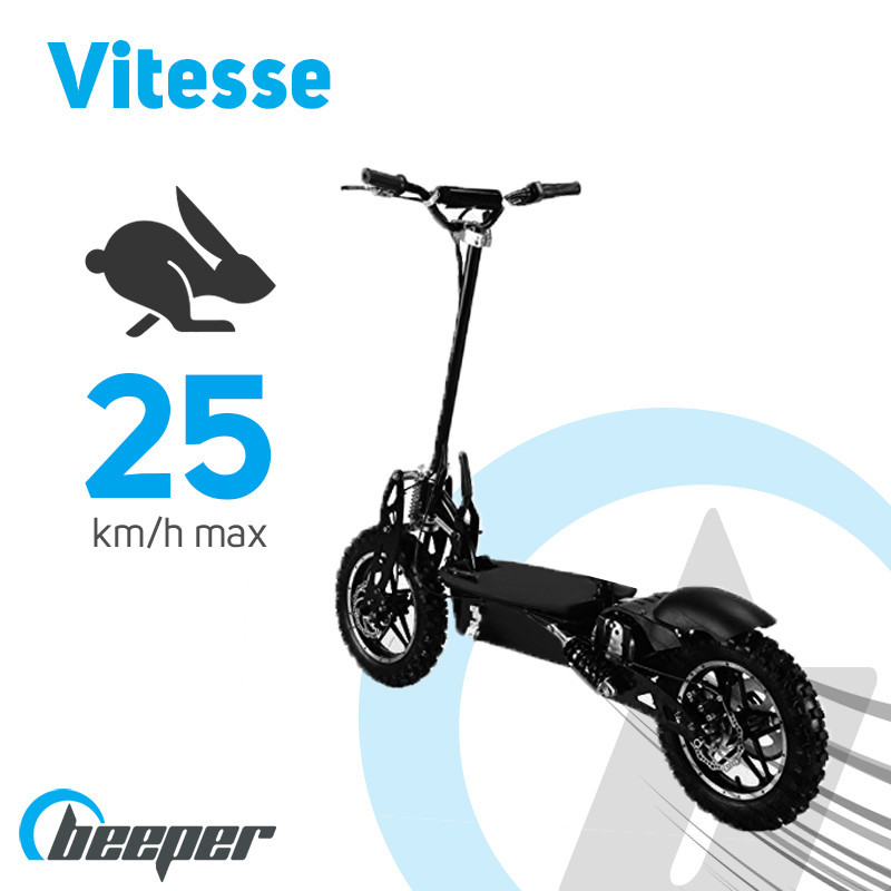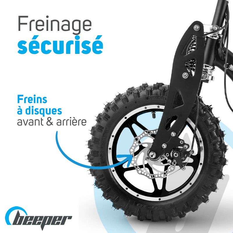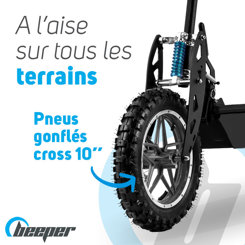 El diseño robusto con su marco de acero scooters todoterreno Beeper, y su neumáticos con clavos de varias capas y su suspensiones de aluminio conviértalo en un producto 100% fiable destinado a conducir con cualquier tiempo (IPX4).