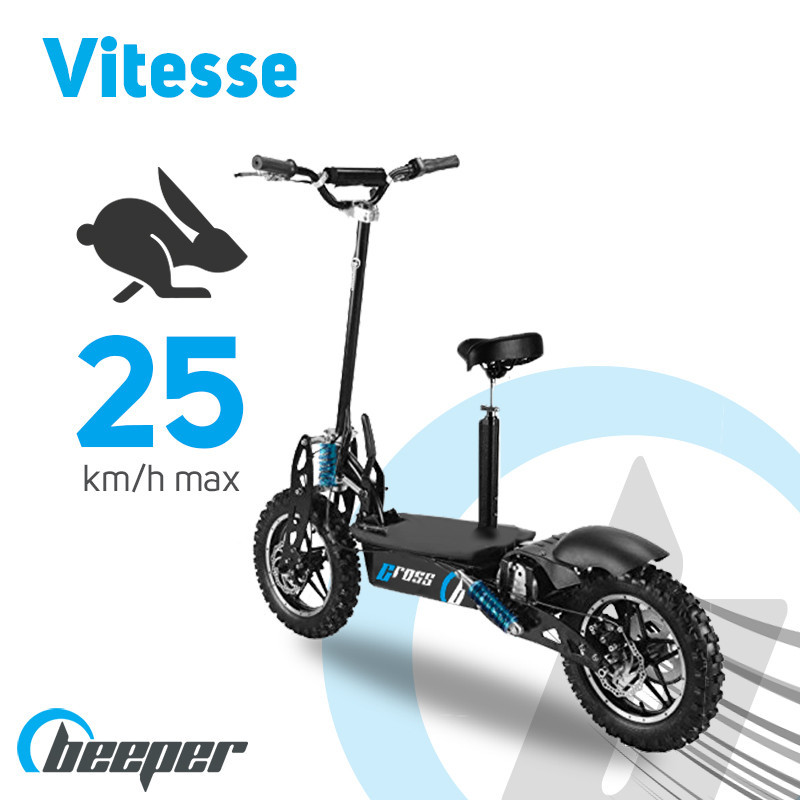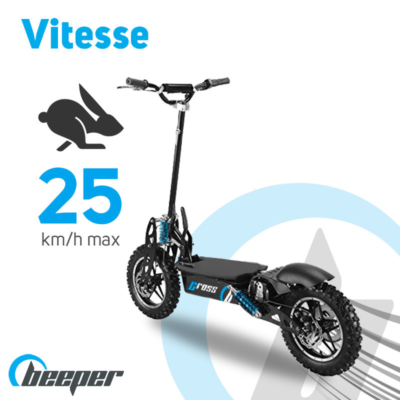 El scooter Beeper CROSS está equipado con un motor de escobillas de 1700W máx según el modelo (1000W nominales) y un batería de 36V 12Ah.