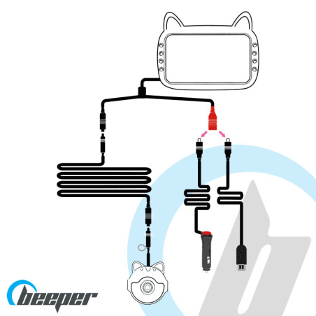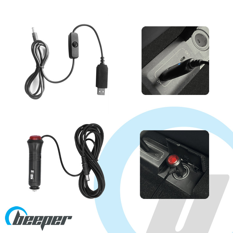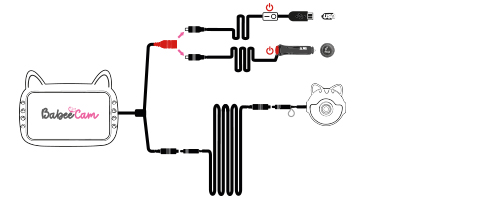 Composé de deux alimentations, vous pouvez connecter l'écran et la caméra sur la prise allume cigare ou sur une alimentation USB-A en fonction de votre véhicule. Un bouton sur les deux alimentations vous permettent d'activer ou désactiver la visualisation de votre enfant. A la coupure du contact du véhicule, BabeeCam1 s’éteint automatiquement.