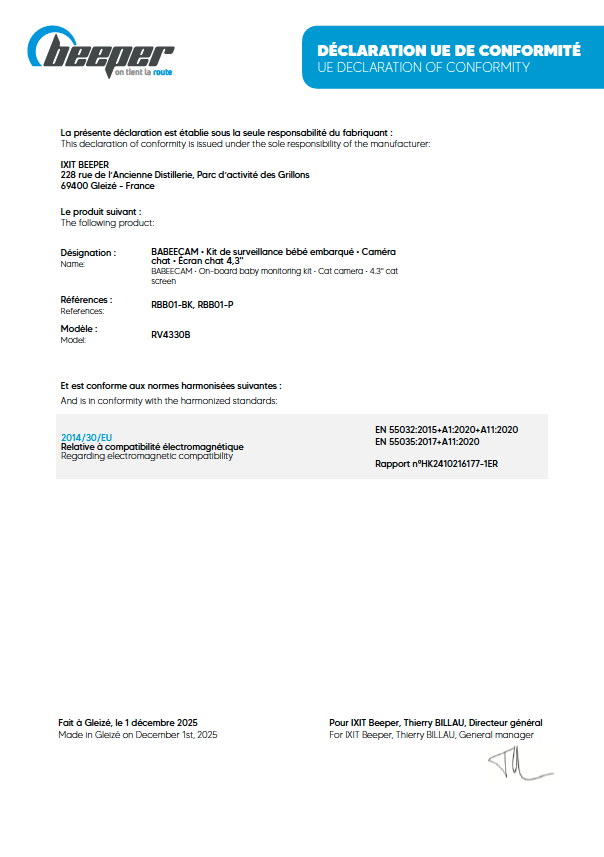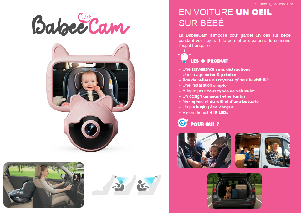 Conçu et développé avec le savoir-faire français, la Babeecam1 se distingue par son design amusant et enfantin avec ses oreilles de chat. Ces éléments apportent une touche ludique & fun tout en restant discret et en s’intégrant harmonieusement dans l’habitacle.