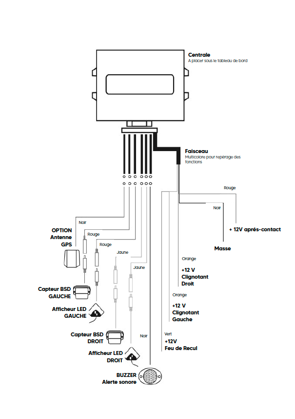 Le système de surveillance d'angle mort BSD est un kit complet composé de :
