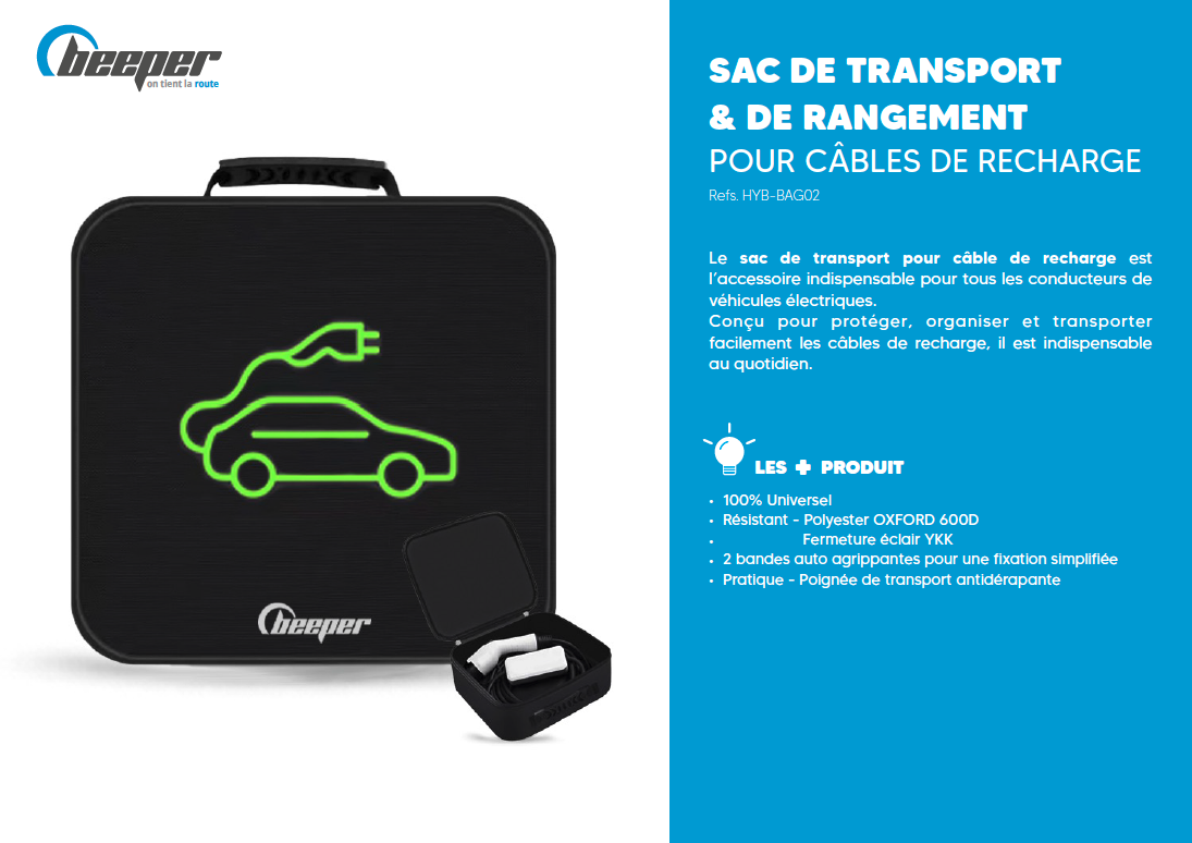 Rangez simplement & efficacement votre câble de recharge dans votre véhicule avec les sacoches de transport Beeper.