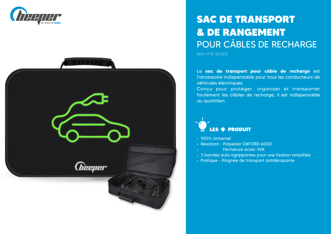 Rangez simplement & efficacement votre câble de recharge dans votre véhicule avec les sacoches de transport Beeper.
